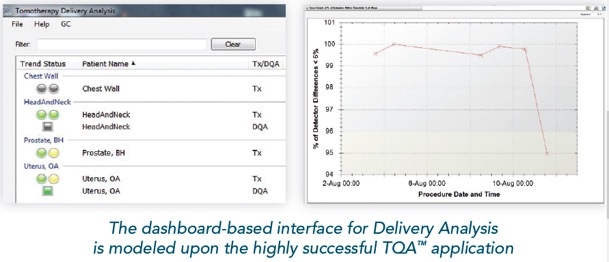 - Το σύστημα Delivery Analysis αναλύει τα δεδομένα από την εκτέλεση της θεραπείας και τα παρουσιάζει με τρόπο άμεσο και ευανάγνωστο στους ακτινοφυσικούς και του ιατρούς του τμήματος. Το σύστημα ενσωματώνει εργαλεία για την λεπτομερή εξέταση όλων των επιμέρους στοιχείων της θεραπείας συμπεριλαμβανομένων της ακρίβειας τοποθέτησης του ασθενούς, την επίδοσης του συστήματος TomoTherapy κτλ.