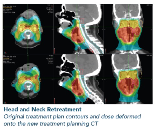 - Ευθυγραμμίζει αυτόματα τα απεικονιστικά δεδομένα και τα δεδομένα των πλάνων θεραπείας (σχεδιασμένες δομές και δοσιμετρικές κατανομές) προηγούμενων θεραπειών με τις νέες εικόνες αξονικής τομογραφίας λαμβάνοντας υπόψη μεταβολές στην ανατομία του ασθενούς (Deformable registration)
